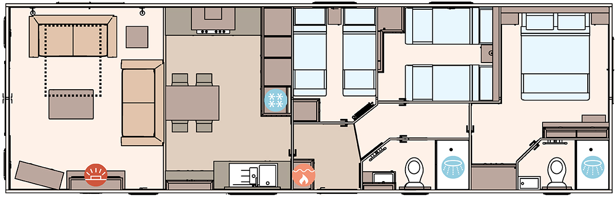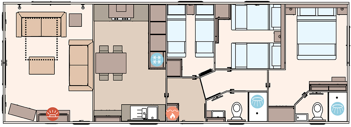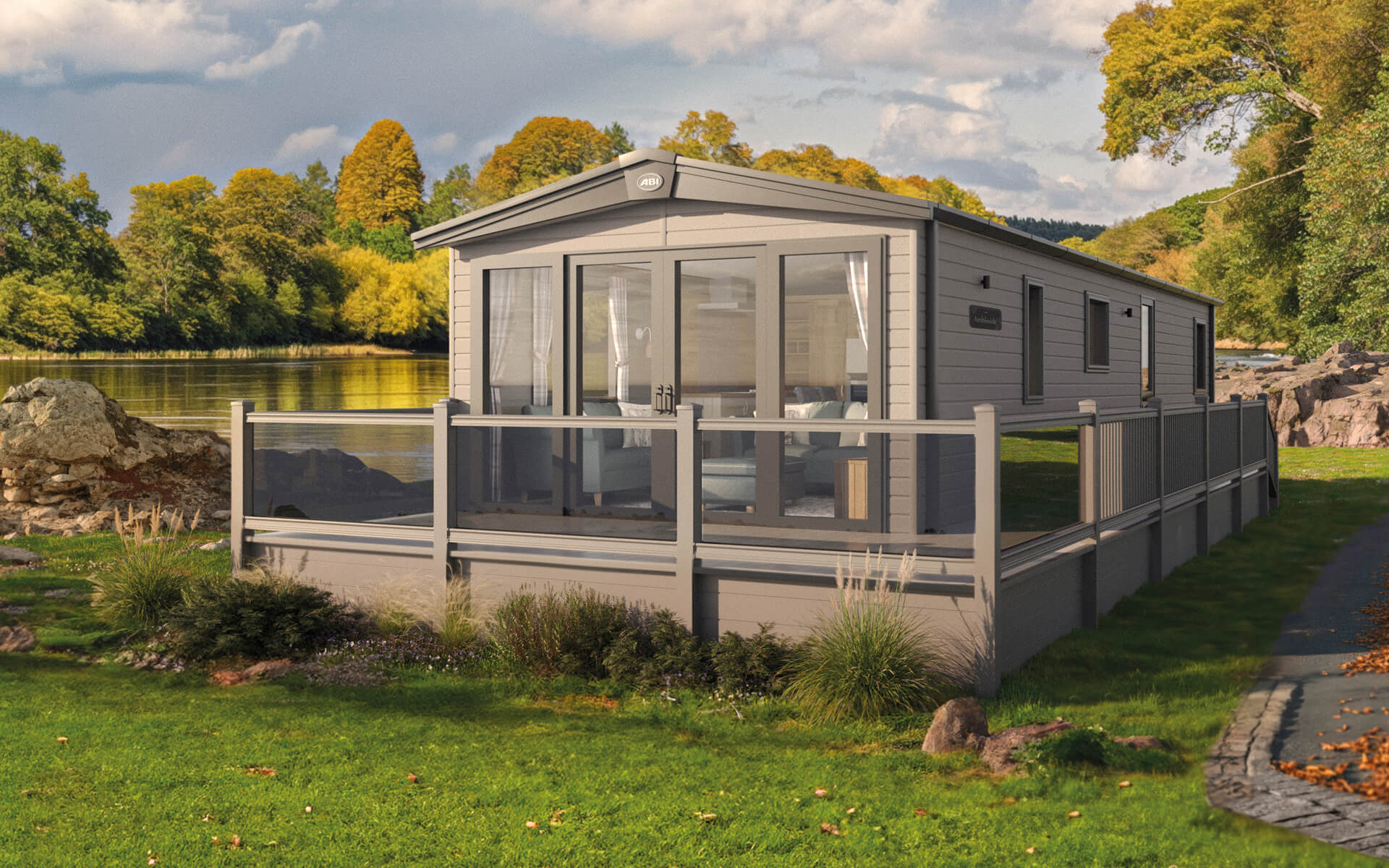 The ABI Ambleside features an airy open-plan layout highlighted by front French or optional panoramic sliding doors, allowing natural light to flood through its full-height walls and vaulted ceiling. Its premium kitchen boasts the regular ABI refinements, like sofe-closing units, an integrated oven and fridge-freezer, and an externally vented cooker hood. The master bedroom offers a king-size lift-up storage bed and en suite shower/toilet, while all bedrooms are fitted with USB sockets, TV points, extractor fans, and quality finishes throughout.