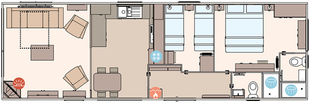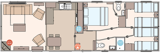 The ABI Langdale captures the essence of a modern cabin retreat, featuring matt finish Champagne aluminium cladding, full carpet underlay, and sliding patio doors that bring plenty of natural light into the living area. At its heart is an open plan kitchen with soft-close doors, a composite sink, and other typical ABI refinements. Comfort and convenience continue into the bedrooms, with a king-size lift-up master bed and USB sockets, plus an en suite shower and toilet in 2-bedroom models.