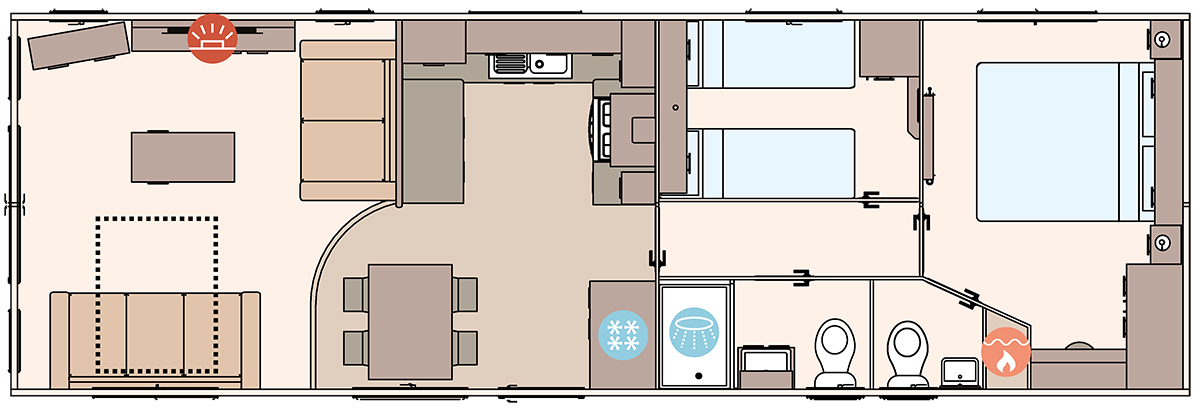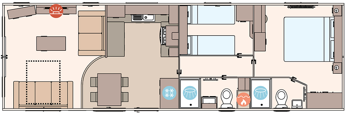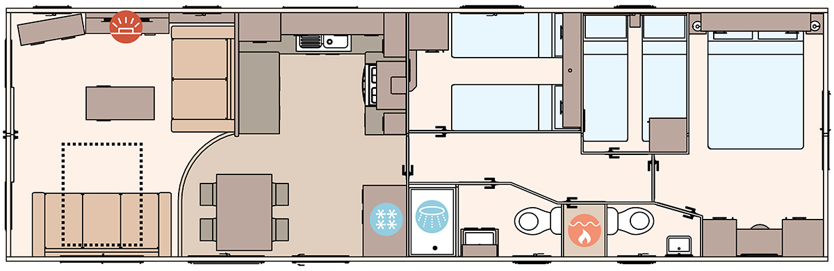 The ABI Wimbledon is built with practical comfort in mind, featuring high-grade Champagne aluminium cladding and carpet underlay throughout for durability and warmth. The kitchen is enhanced with 40mm worktops, a composite sink, soft-close fittings, and a powered cooker.