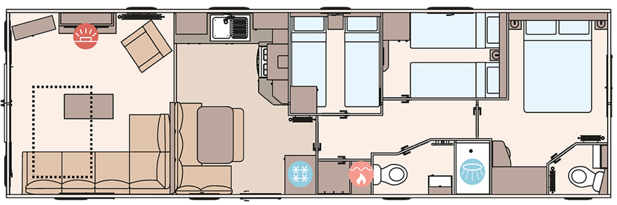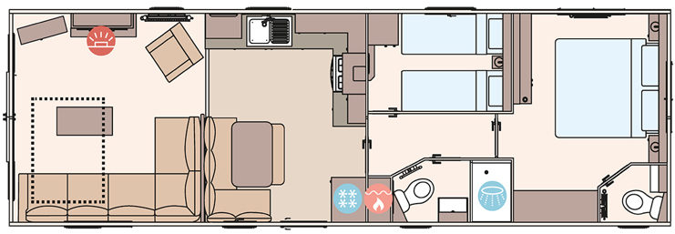 The ABI Wimbledon features a traditional-inspired interior with modern construction, offering a fully-equipped shaker-style kitchen, freestanding dining furniture, and a spacious open-plan layout. It includes a domestic-style front door, matt-finish Champagne aluminium cladding, and double glazing as standard. The lounge is enhanced by a fixed chaise sofa, integrated electric fire, and USB charging points, combining classic charm with everyday practicality.