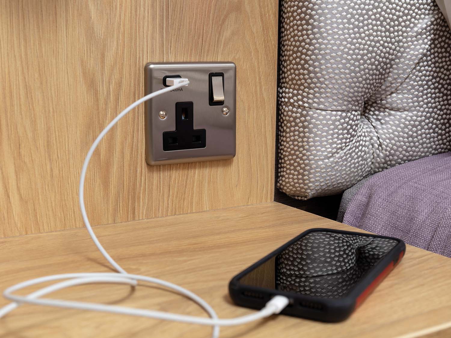 - King size bed with oversized button-back headboard, side lights and overhead wall cabinets.