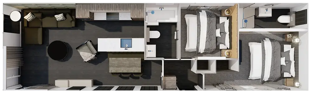 Introducing the Kahlo, our new flagship model for 2024. Experience a truly exceptional getaway like never before, featuring a groundbreaking addition to our portfolio – the striking mono pitch roof. The Kahlo is the epitome of luxury and style. With exceptional design and a standout exterior, it creates a lasting impression. The spacious interior provides ample storage and comfortable bedrooms, ensuring a tranquil stay. Indulge in the luxury bath with a rainfall shower and enjoy modern amenities such as blackout curtains, USB plugs, and smart TV space.