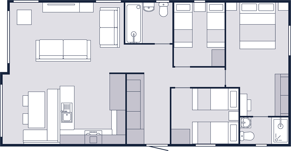 If you’re looking for a comfortable lodge with space for all the family, the Liberte is the lodge for you. We know that life happens so we designed the Liberte to have everything you want, and didn’t know you needed, so you can drop your suitcases off and relax. From the open plan, free flowing living space, to the customisable guest bedroom. From the full-size bath to the practical storage solutions. The Liberte has it all without the price tag. Whether you want to host, nap, or primp and preen – there’s space to do it all.